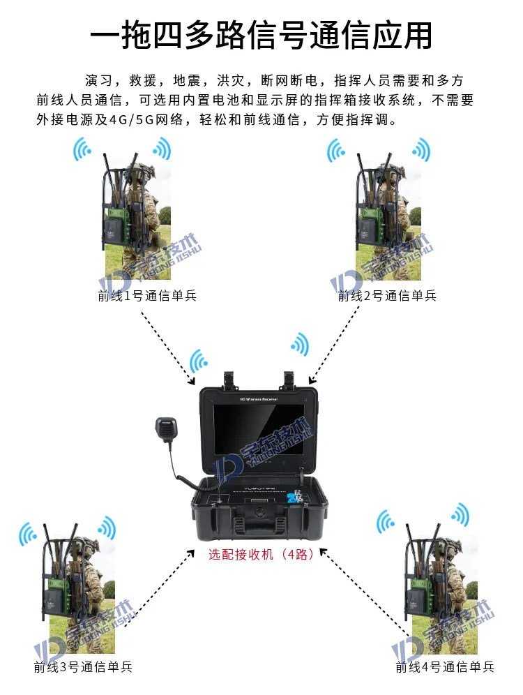 16、接收電臺為指揮箱款,內置電池和顯示屏,四宮格顯示四路視頻畫面